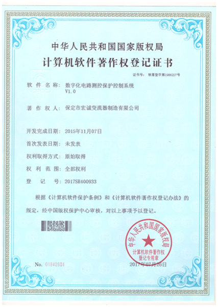 計(jì)算機(jī)軟件注冊(cè)權(quán)登記證書(shū)——數(shù)字化電路測(cè)控保護(hù)控制系統(tǒng)V1.0